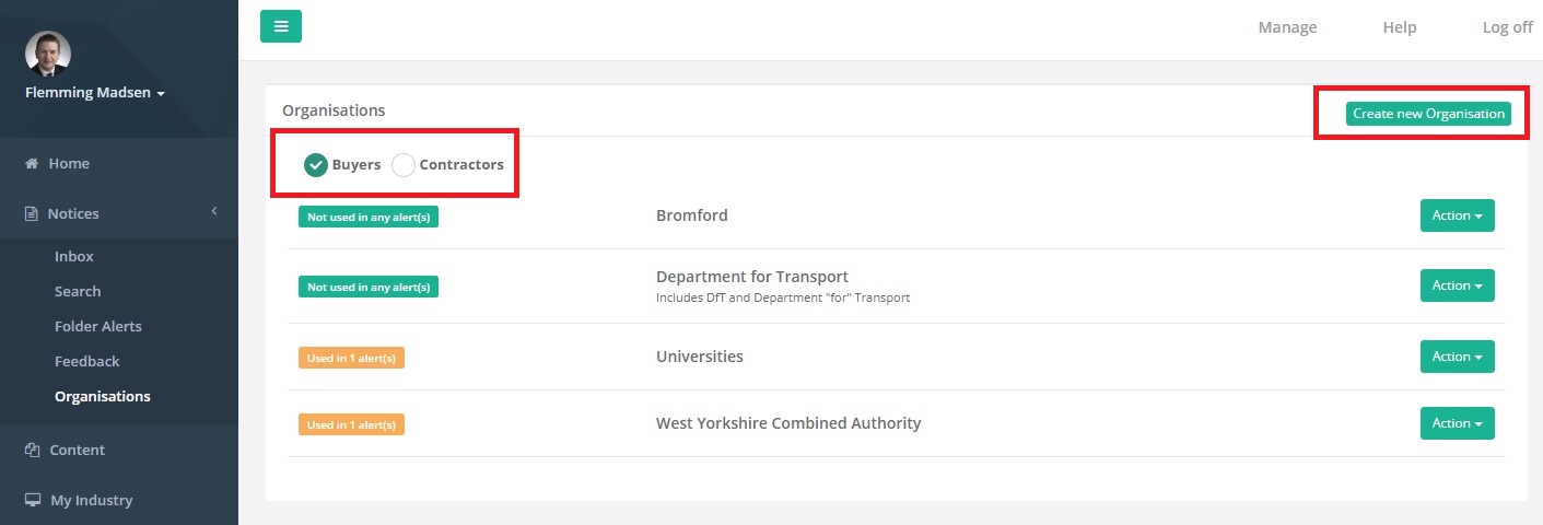 First, select if you want to crate a buyer or a contractor. Then, click the button Create new Organisation.