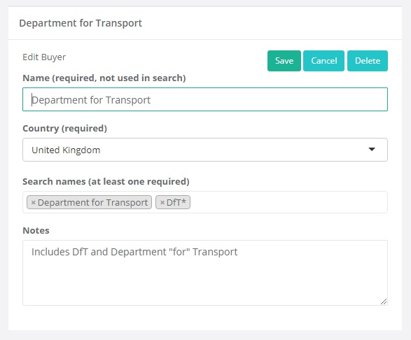 You can either create a list of search names used by these buyers, as was shown earlier in this article where we use both the names Department for Transport and DfT.