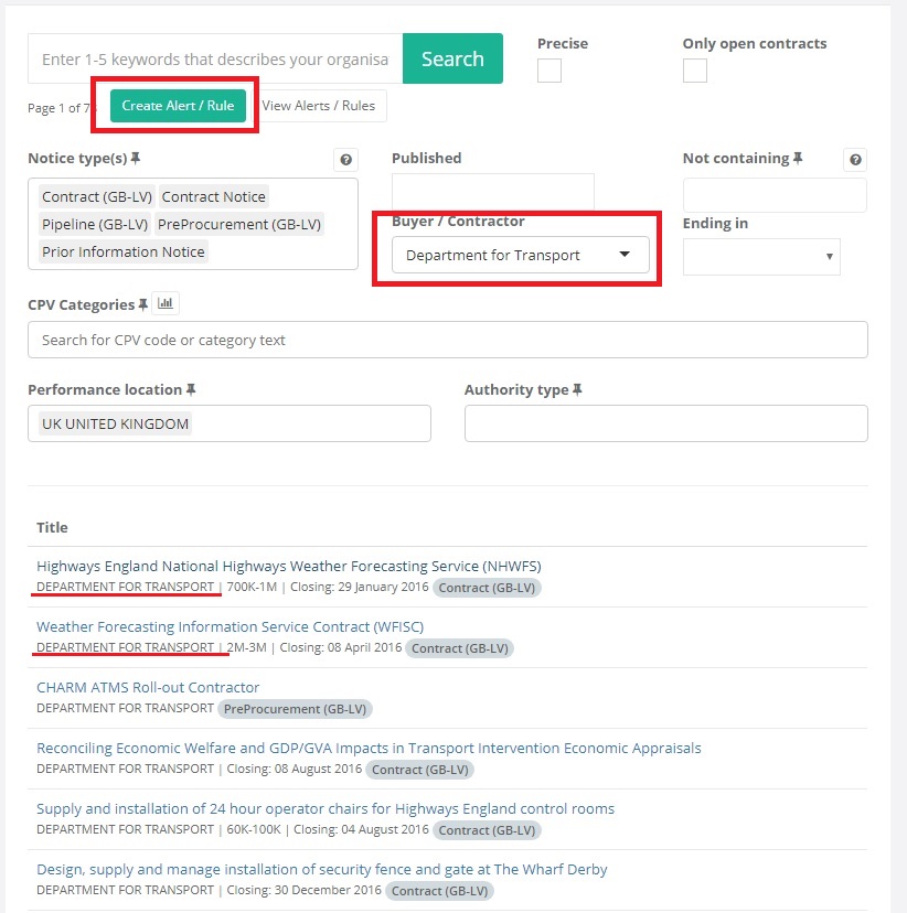 To create an alert to get all new contracts from Department for Transport, just click the Create Alert / Rule button.