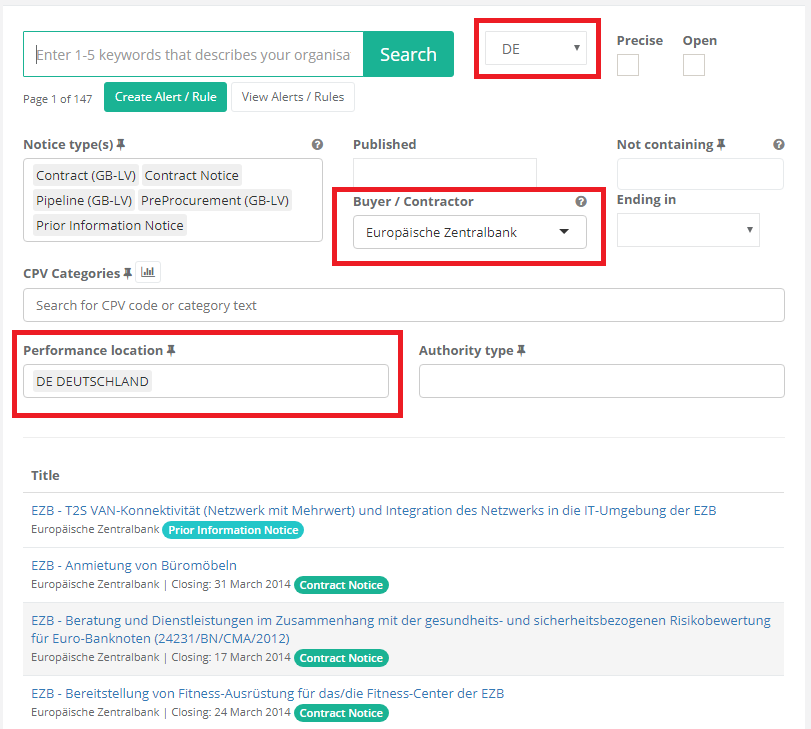 It is also possible to search for buyers in a specific language, so if you want all notices in German from Europäische Zentralbank (European Central Bank), just use the German spelling when naming the organisation.