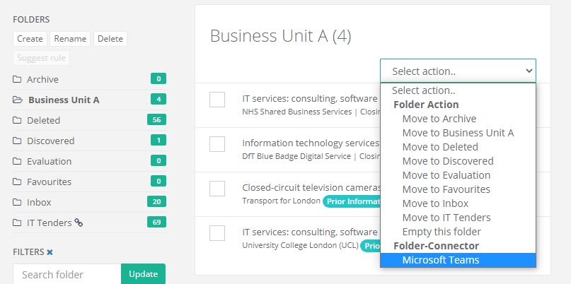 Every time a new procurement notice is matched with a search, it is delivered into the folder and thereby into the Teams channel(s).