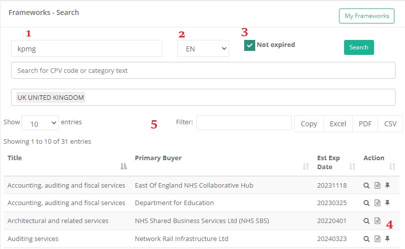To the right of the search results, you will find three “action icons” (4). The first will show the framework details. The second will show all suppliers who have been awarded under the framework.