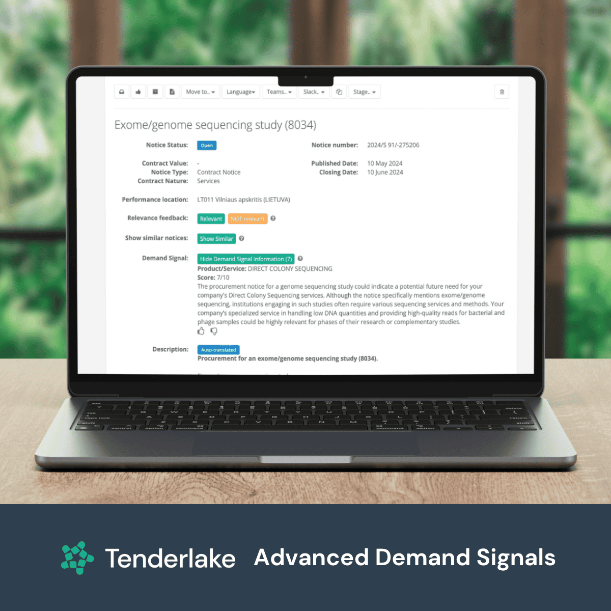 Even though the notice does not mention AI at all, Tenderlake correctly identifies the opportunity and generates the following signal: