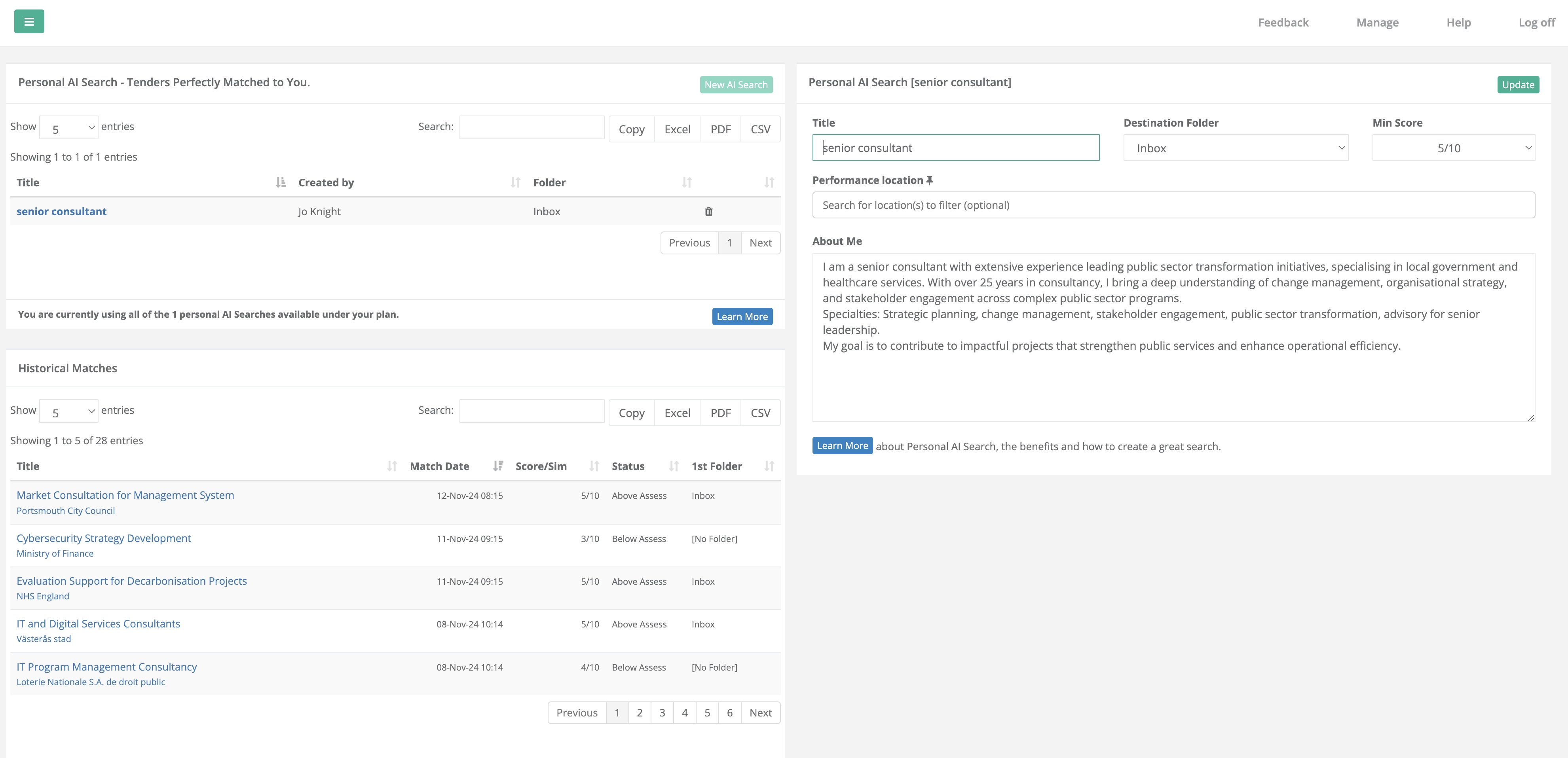 Unlike traditional keyword-based searches, Tenderlake Pro’s Personal AI Search understands that expertise goes beyond technical qualifications. It recognises how skills, industry experience, and leadership capabilities translate into real-world project requirements—even when buyers describe them differently. This means a consultant who has led public sector transformation can be matched with tenders seeking service optimisation, stakeholder collaboration, or restructuring support, even if those exact terms aren’t listed.