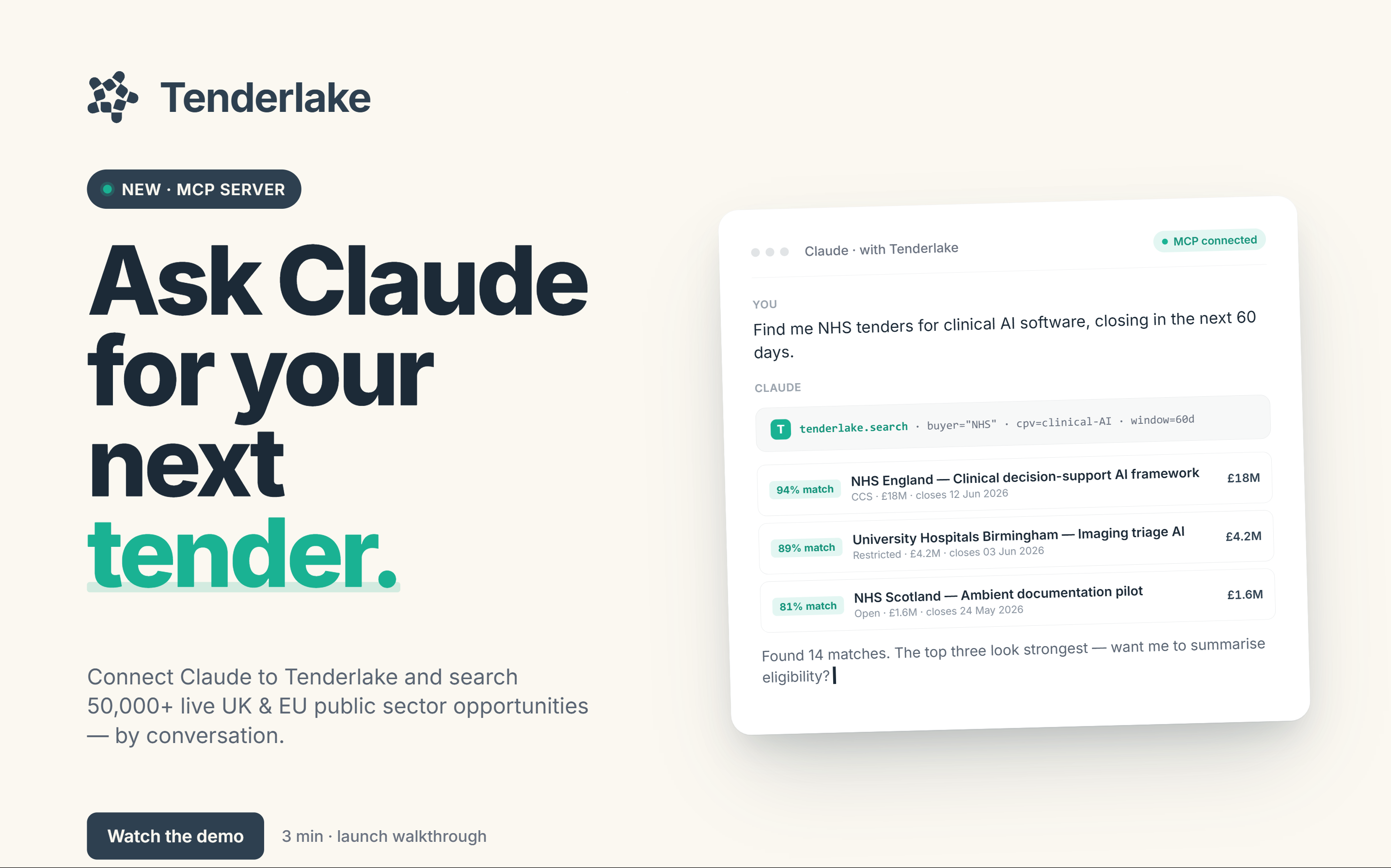 Same data, new surface. Nothing about your Tenderlake data, scoring, or matching changes. This is the workgroup your team already trusts, exposed through a chat interface for the moments when chat is the right tool for the job.